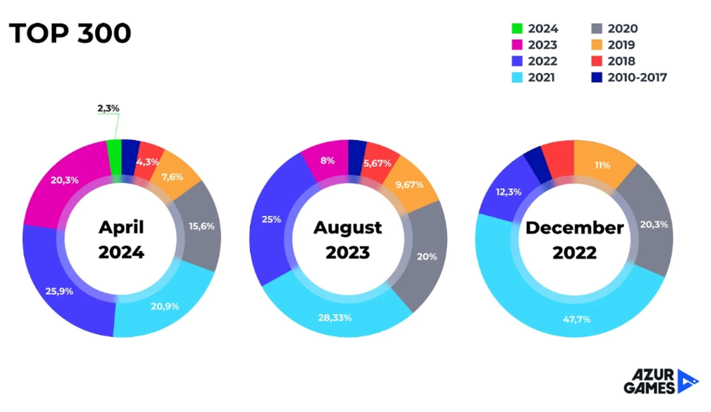 这个图表非常重要。当我们说打造一款新的超休闲游戏越来越难的时候,并不是说那就没有新游了。如果你观察近些年来的游戏份额分布,你会发现TOP 300中最大的份额永远都是被前两年发布的产品所占据的。