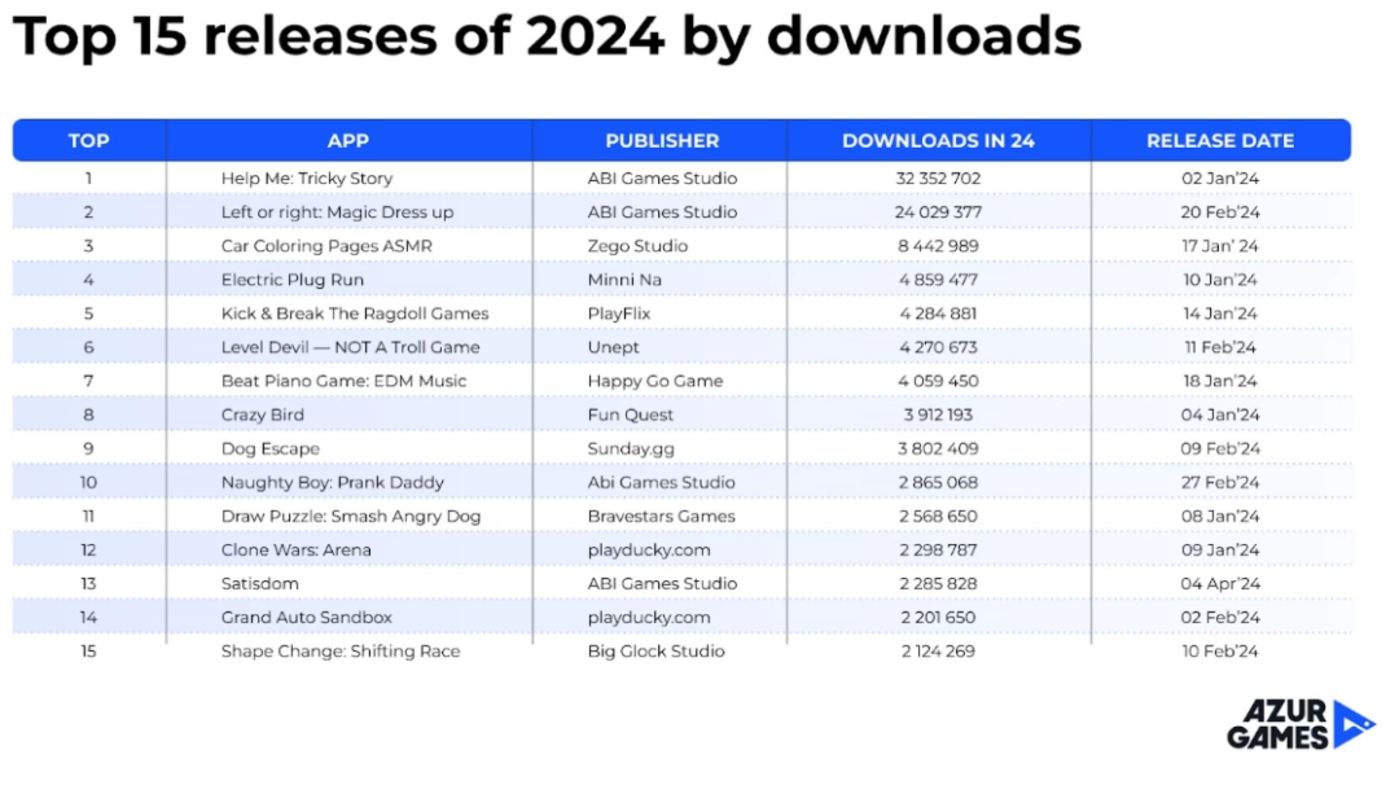 在2024年发布的超休闲游戏中,下载量最高的是两款游戏《Help Me: Tricky Story》和《Left or right: Magic Dress up》都是来自ABI Games Studio,下载量均达到了千万级别。