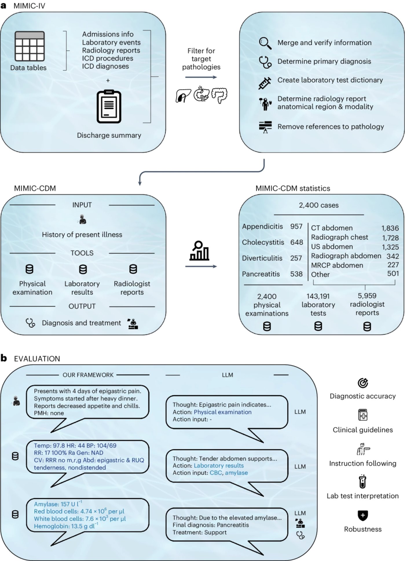 为了进一步研究 LLM 在临床诊断中的潜力,来自慕尼黑工业大学的研究团队及其合作者基于医疗信息市场重症监护数据库(MIMIC-IV)制作了一个涵盖 2400 个真实患者案例和 4 种常见腹部疾病(阑尾炎、胰腺炎、胆囊炎和憩室炎)的数据集,模拟现实的临床环境,重现从急诊到治疗的过程,从而评估其作为临床决策者的适用性。
