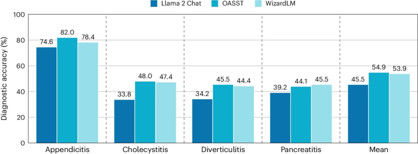 医生结果显示,当前 LLM 在所有疾病的整体表现上显著逊色于医生(P < 0.001),诊断准确性差距在 16%-25% 之间。虽然模型在简单的阑尾炎诊断中表现较好,但在胆囊炎等其他病理的诊断中表现不佳,特别是 Meditron 模型在胆囊炎诊断中失败,常将患者诊断为“胆结石”。