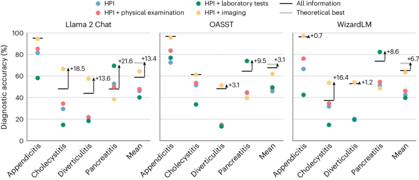 图|自主临床决策场景下的诊断准确率。对比全信息提供场景下,模型判断正确率整体都有明显下降。LLM 在诊断阑尾炎时表现最好,但在胆囊炎、憩室炎和胰腺炎这三种病理上表现较差。