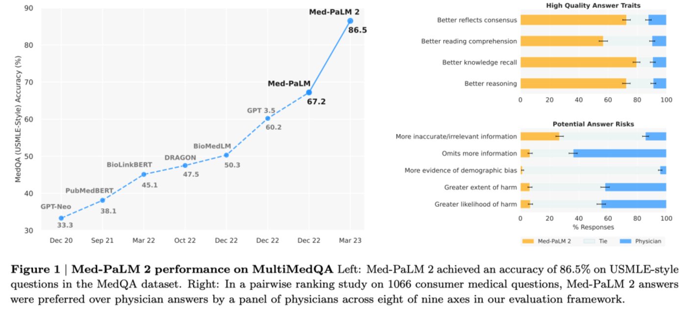 这种担心,并非空穴来风。毕竟,谷歌的大模型(Med-PaLM 2)已经轻松拿下了美国医学执照考试,达到了医学专家的水平。