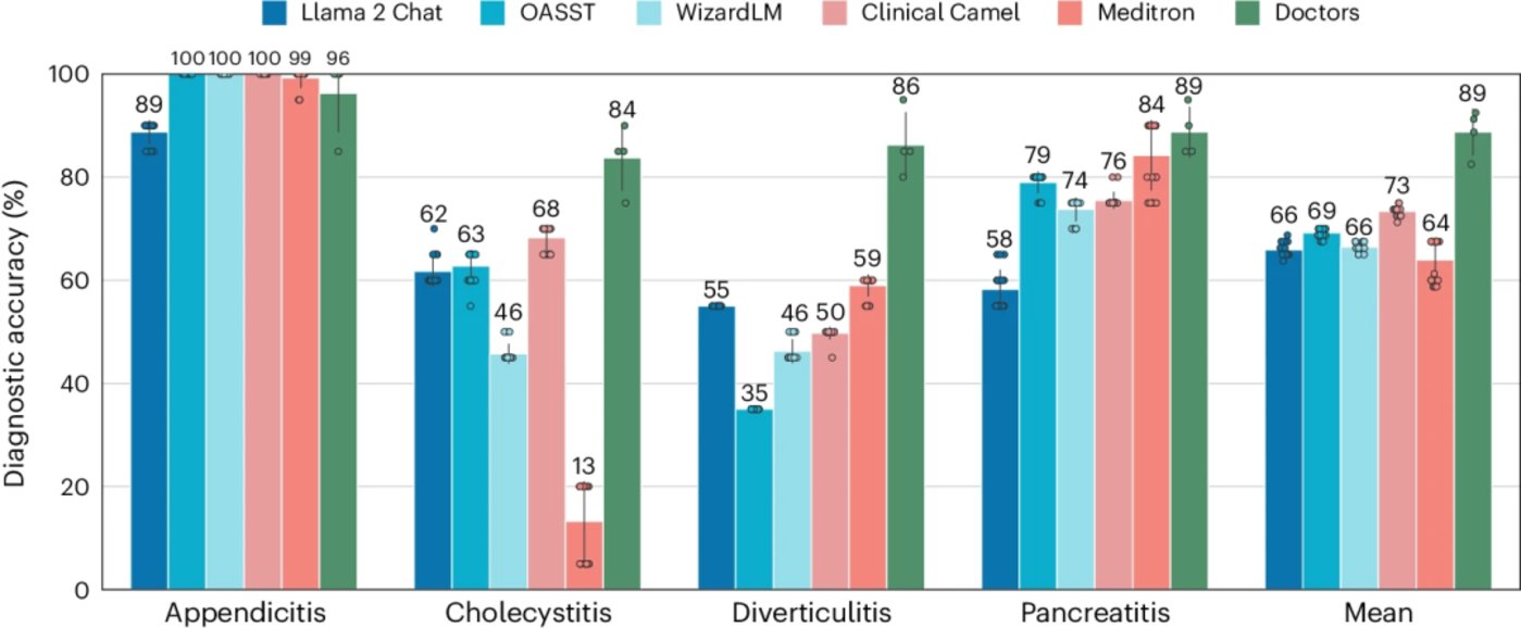 医生的诊断正确率为 89%,而 LLM 的诊断正确率仅为 73%。在一个极端情况(胆囊炎诊断)下,LLM 正确率仅为 13%。