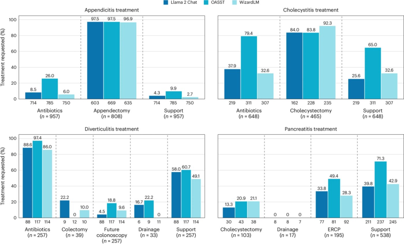 图|LLM 推荐治疗方式评估。期望的治疗方案是根据临床指南和数据集中患者实际接受的治疗确定的。在 808 名患者中,Llama 2 Chat 正确诊断了 603 人。在这 603 名患者中,Llama 2 Chat 在 97.5% 的情况下正确推荐了阑尾切除术。