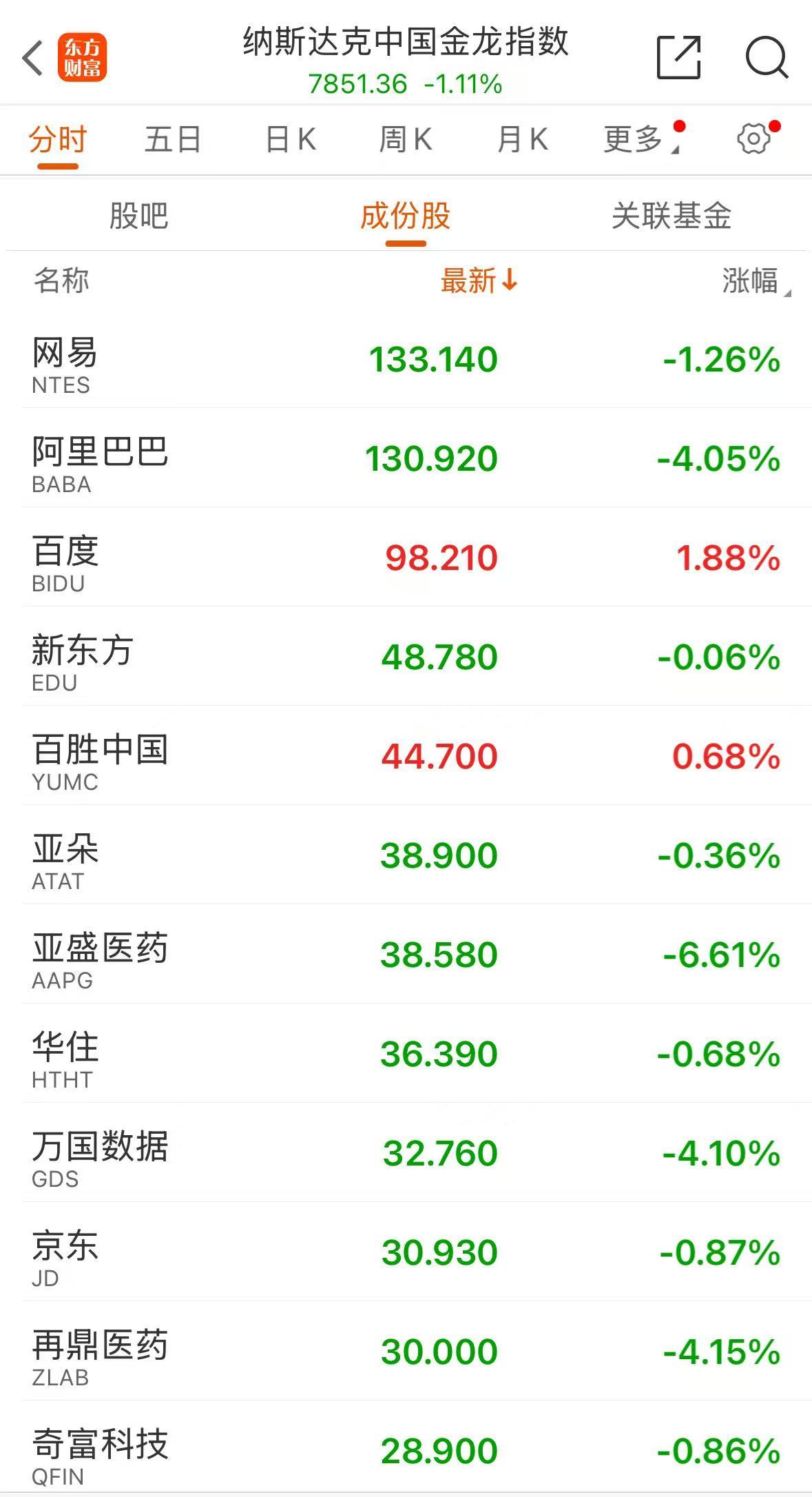 热门中概股多数下跌,纳斯达克中国金龙指数收跌1.11%。阿里巴巴跌超4%,蔚来跌超3%,小鹏汽车跌超2%。