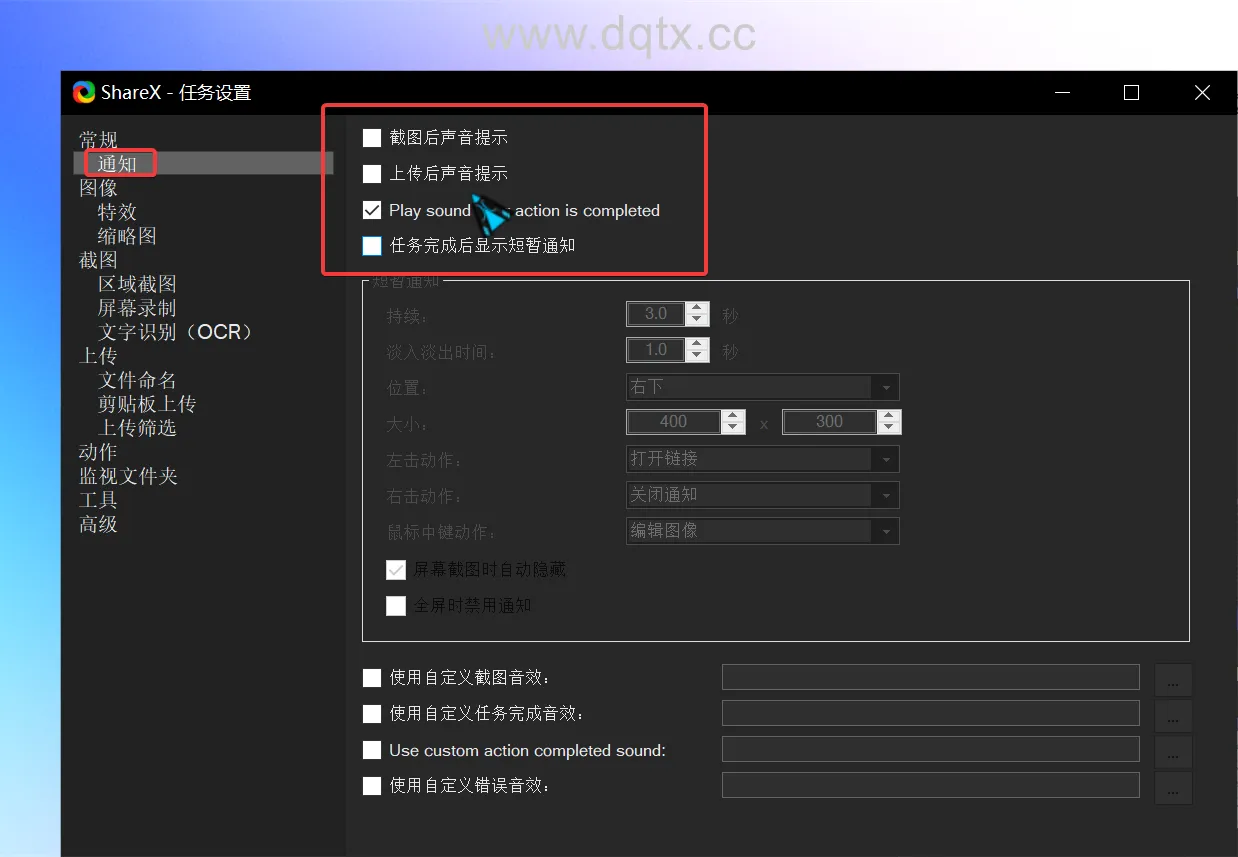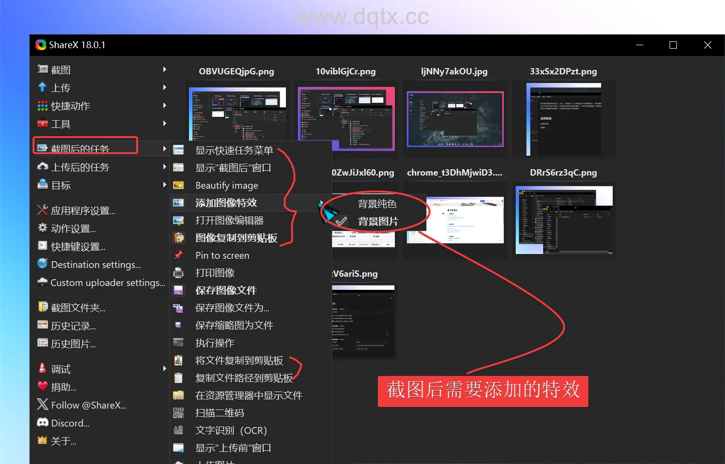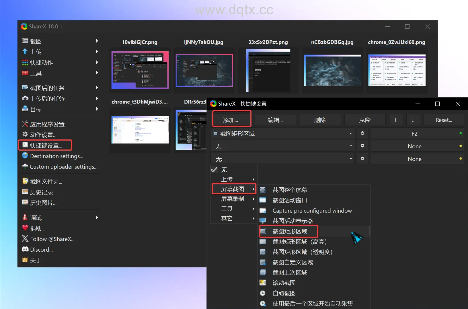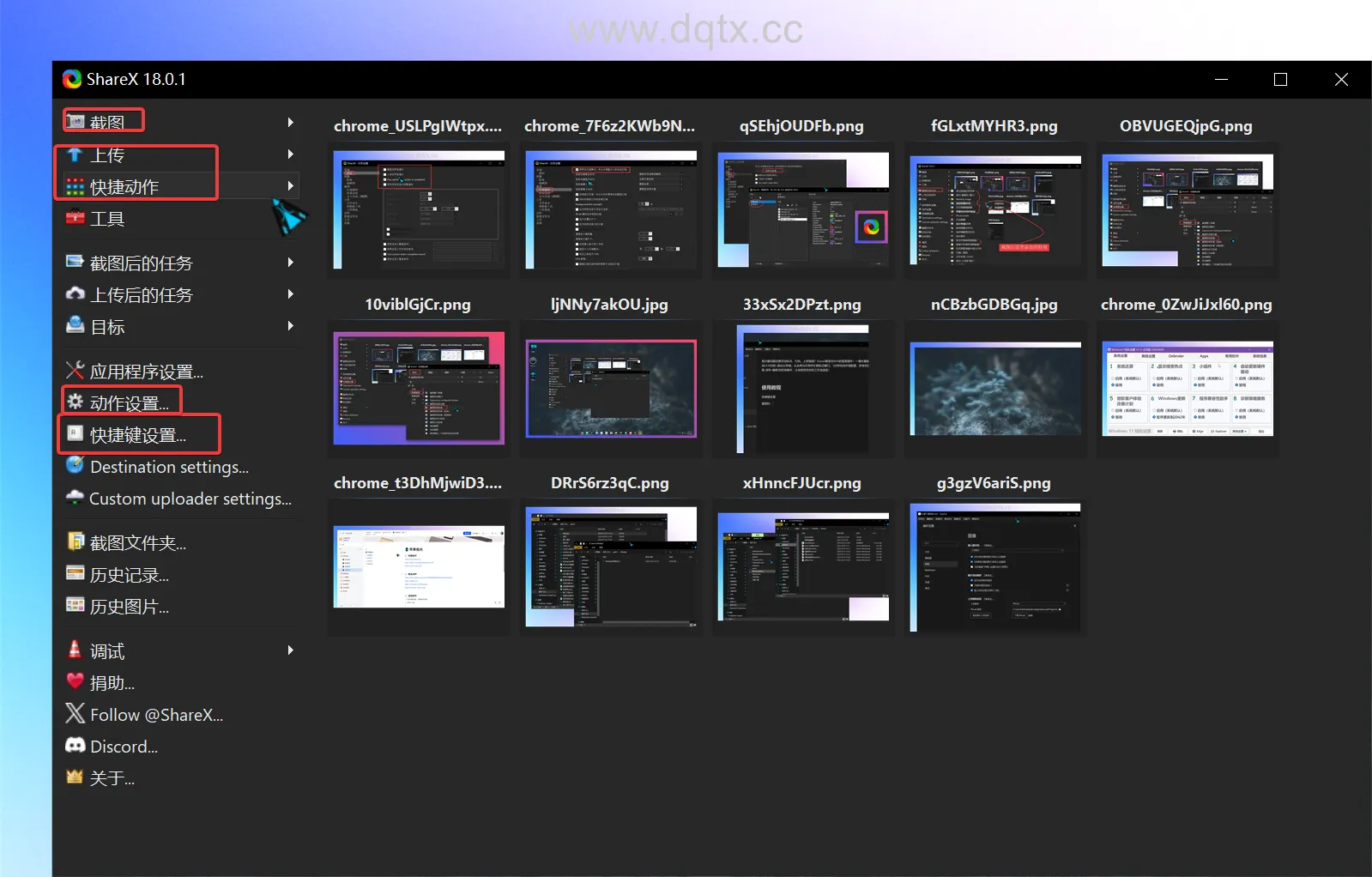 打开 ShareX 后,左侧是功能导航,右侧是任务历史记录。最常用的是: