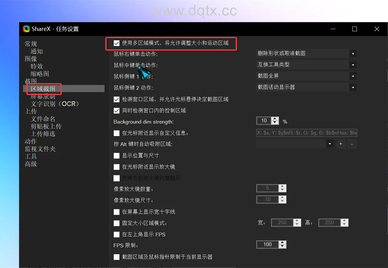 多区域截图模式适合一次性截取多个不相邻的区域,ShareX 会把它们自动拼在一张图里,可以在任务设置里,找到区域截图,勾选使用多区域模式,也可以在按下截图快捷键后,右上角设置里勾选多区域模式。