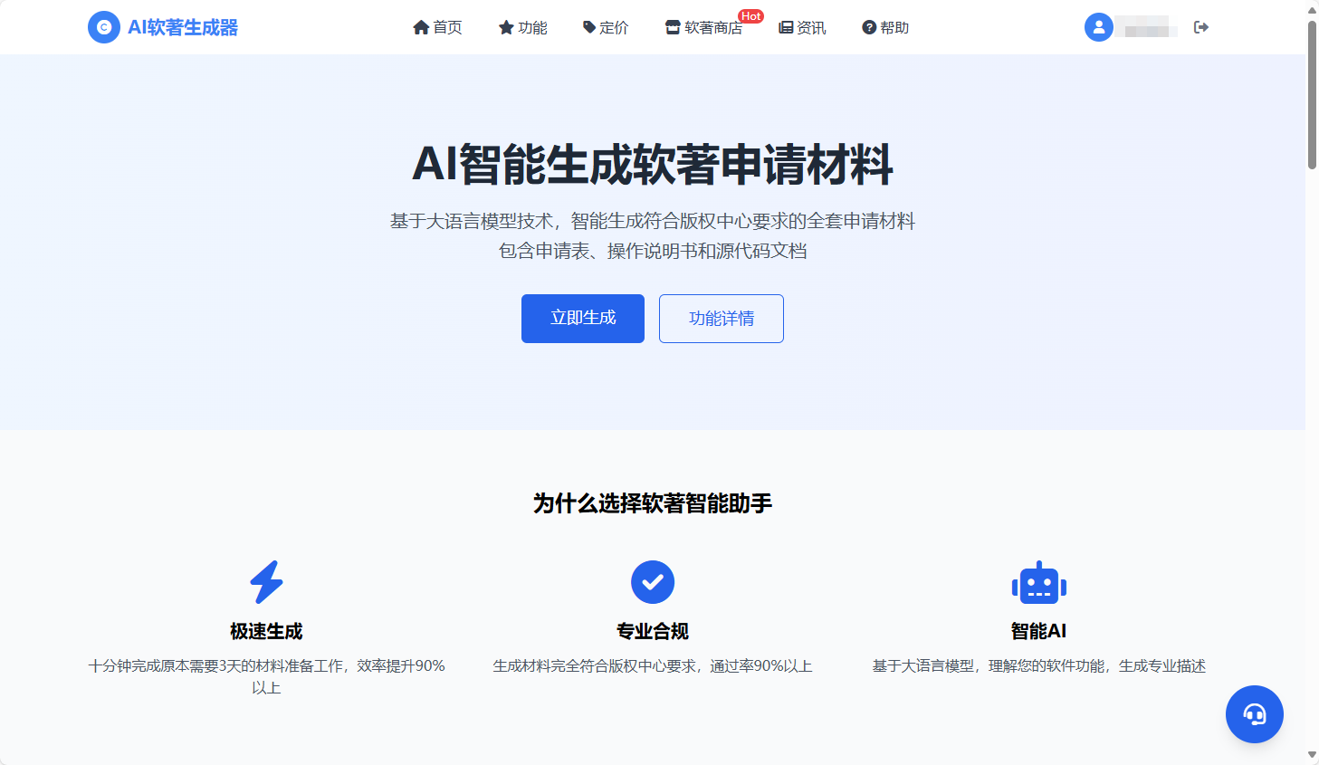智能生成文档:通过 AI 自动生成符合规范的软件著作权申请文档,包括源代码、用户手册、功能说明等。