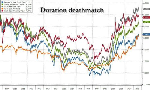对此,号称“华尔街最精准分析师”的美国银行首席策略师哈特内特(Michael Hartnett)在其最新的资金流动报告《从无形之手到有形之拳》中,就提到了这一现象。哈特内特指出,目前英国长期债券收益率已到了5.6%(自1998年以来最高),法国为4.4%(自2009年以来最高),日本为3.2%(自1999年以来最高),同时美国30年期债券收益率一度向上测试了5%。