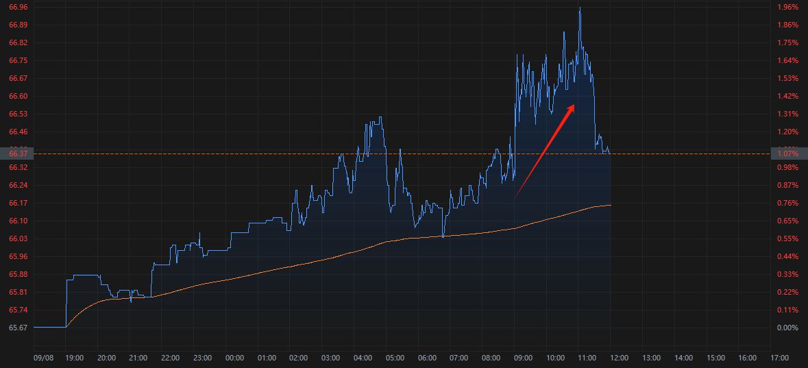 受该消息影响,国际油价明显冲高,布伦特原油期货价格从每桶66美元附近一度升破67美元,日内涨幅一度达到1.9%。