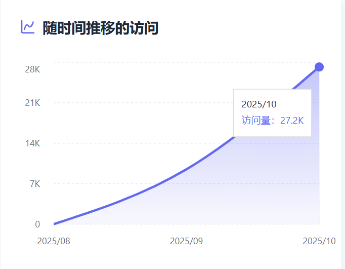 GrsAi APi 是在2025年4月13日上线,通过朋友介绍获得了一个大客户,就开始专注于这个 Api 产品。运营了大半年从最开始的几百访问量,到 8k 九月的 9.49k,10 月甚至达到了 27.2k,这意味着,在刚刚过去的一个月里,我的个人项目 GrsAi API 平台(https://grsai.com/)访问量实现了近三倍的暴涨。