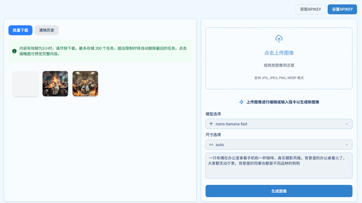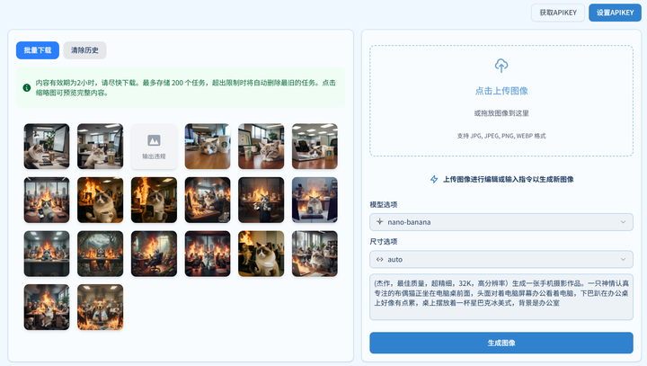 需要特别注意的是它保存机制:生成的内容有效期为 2 小时,需要及时下载。并且系统最多保留 200 个任务,超出会自动清理最早的任务。