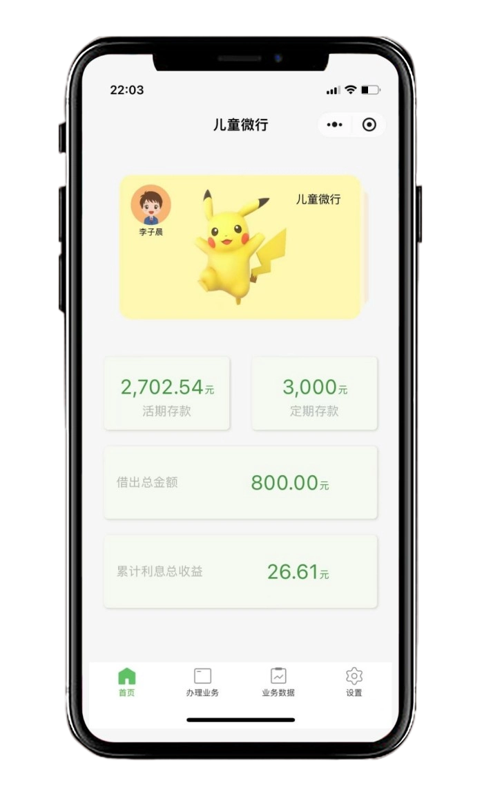 父母扮演银行,孩子扮演银行客户,孩子自己的钱交给父母保管,金额多少,利息计算,钱如何被使用全部记录在儿童微行里。
