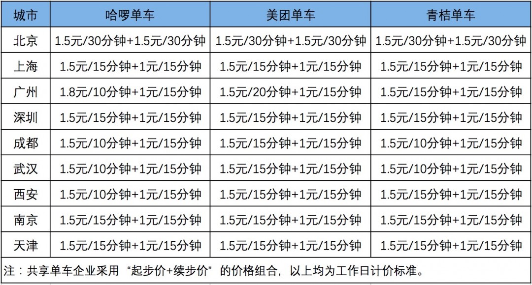 在上海、深圳、南京、天津等城市,美团、哈啰、青桔单车的起步价均为前15分钟1.5元,超过15分钟,计费标准为每15分钟增加1元。