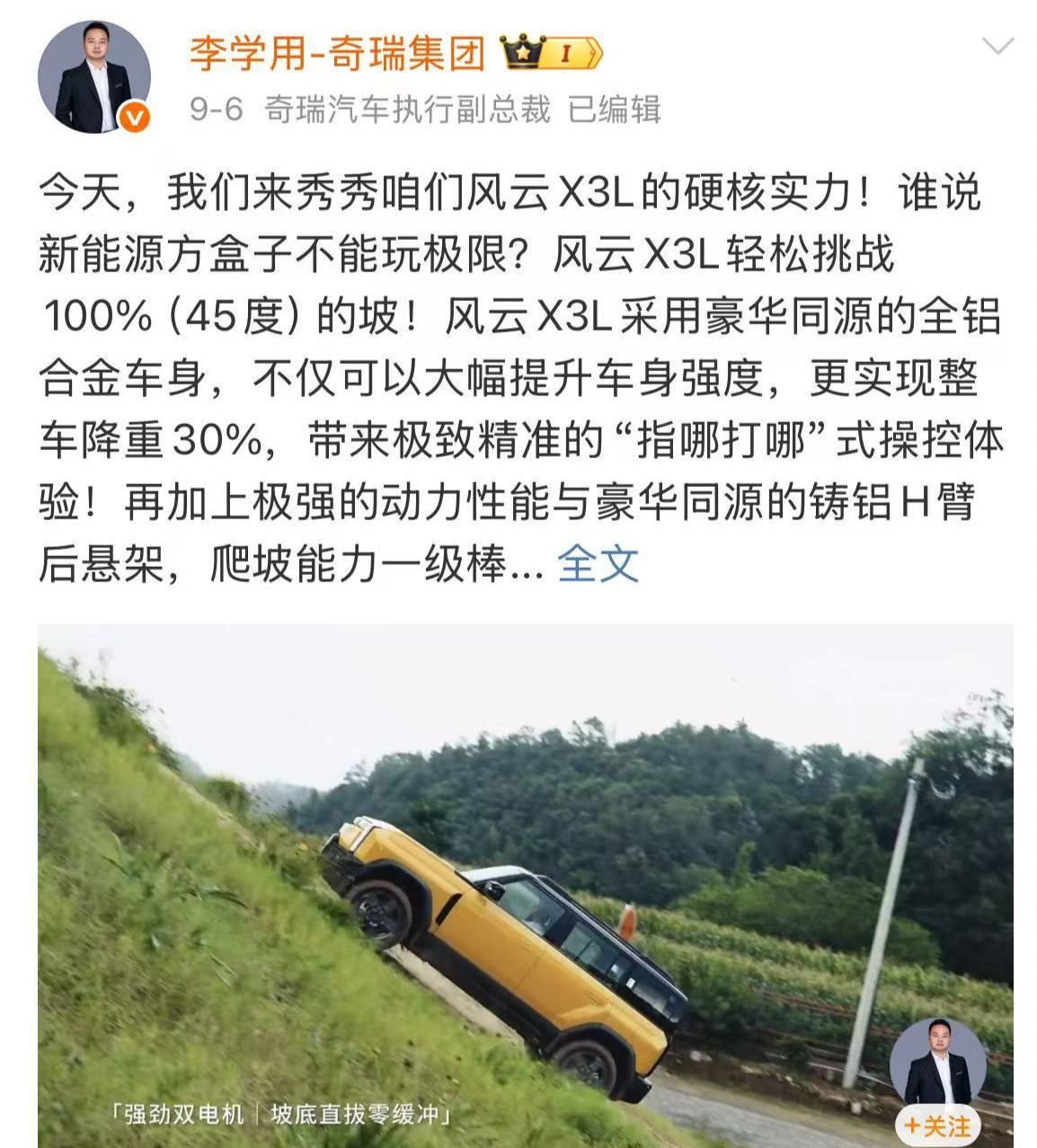 与此同时,在奇瑞汽车的营销宣传工作之中,“性能”“安全”相关内容是其重点宣传的标签之一。在奇瑞汽车执行副总裁李学用的社交平台上,就发布了不少有关车辆测试的内容。