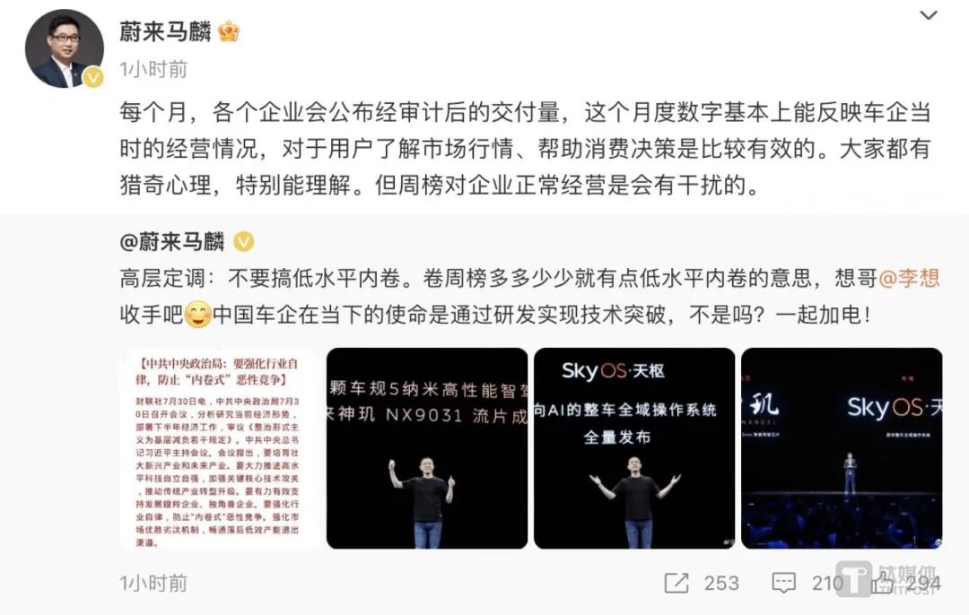 在理想发布最新周榜后不久,蔚来汽车公关总监马麟在微博上专门@李想本人表示,卷周榜多多少少就有点低水平内卷的意思,想哥@李想收手吧。中国车企当下的使命是通过研发实现技术突破。并发出反问:“不是吗?”