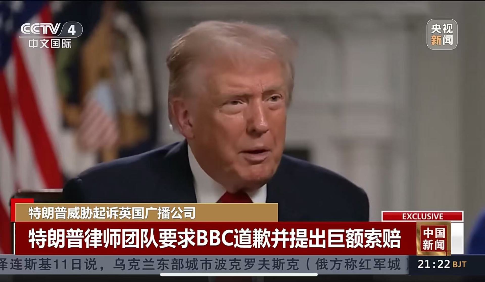 特朗普律师团队10日要求BBC撤回相关纪录片并道歉,否则将提起诉讼,索赔至少10亿美元。BBC13日就误导性剪辑向特朗普道歉,但拒绝特朗普方面提出的赔偿要求。美国总统特朗普当地时间14日表示,下周将就BBC剪辑拼接其讲话一事对BBC起诉,并索赔10亿到50亿美元。