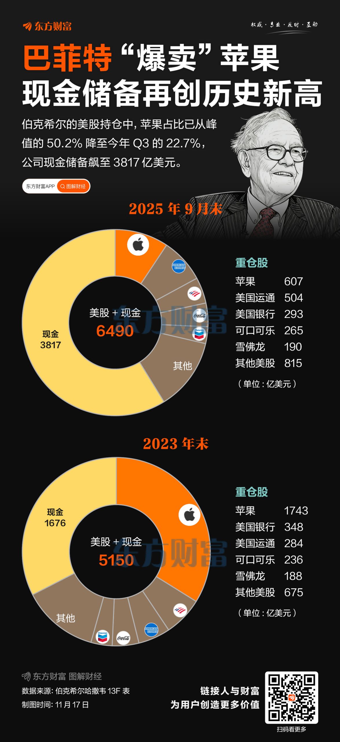 巴菲特旗下的伯克希尔·哈撒韦上周末公布了第三季度的13F表。如此前外界所猜测的一样,“股神”果然在第三季度抛售了大量苹果股票,伯克希尔的现金储备随之飙至3817亿美元,刷新历史纪录。