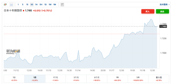 由于投资者权衡首相高市早苗可能推出的大规模财政刺激计划的影响,日本10年期国债收益率今天一度攀升至1.75%以上,接近2008年以来的最高水平。