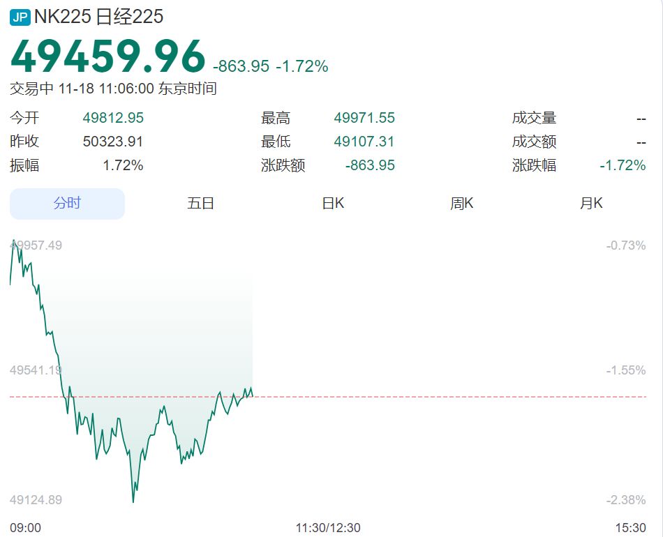 日经225指数一度大跌超1000点。截至发稿,日经225指数下跌1.72%至49459.96点。