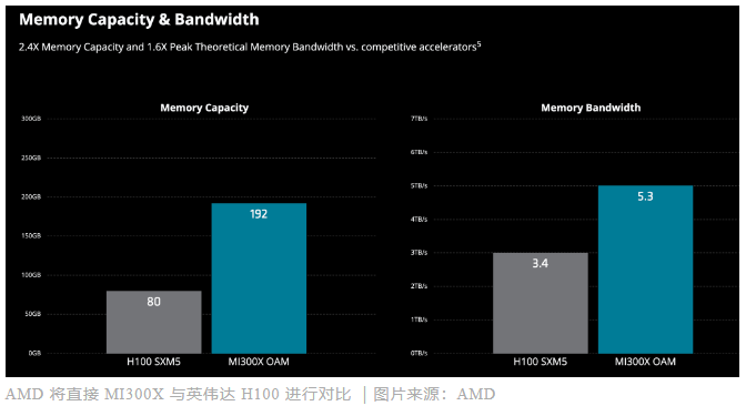 该芯片提供了比竞争对手更大的内存容量,达到 192GB,声称可以减少某些任务所需的 GPU 数量,从而可能使 AMD 成为更具成本效益的选择。相比之下,H100 支持 120GB 的内存,因此需要更多 GPU 来运行推理。