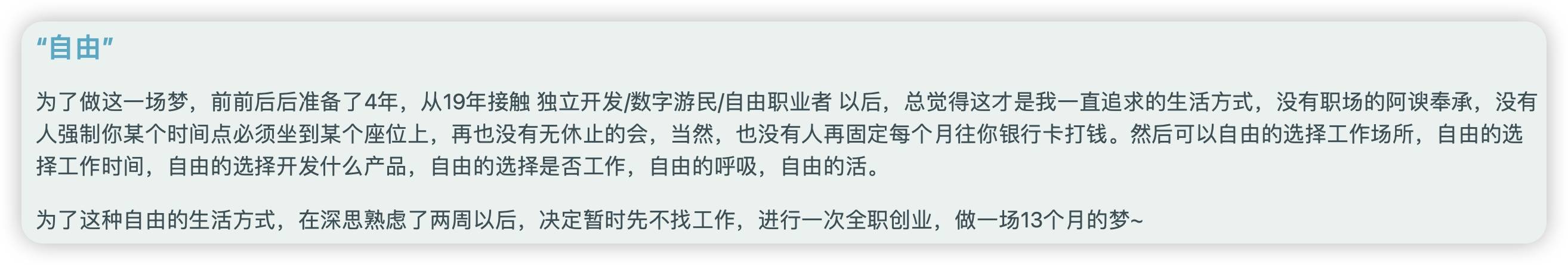 去年 6 月离职,7 月份决定不找工作,全职创业,到现在,不知不觉已经过了 13 个月了。
