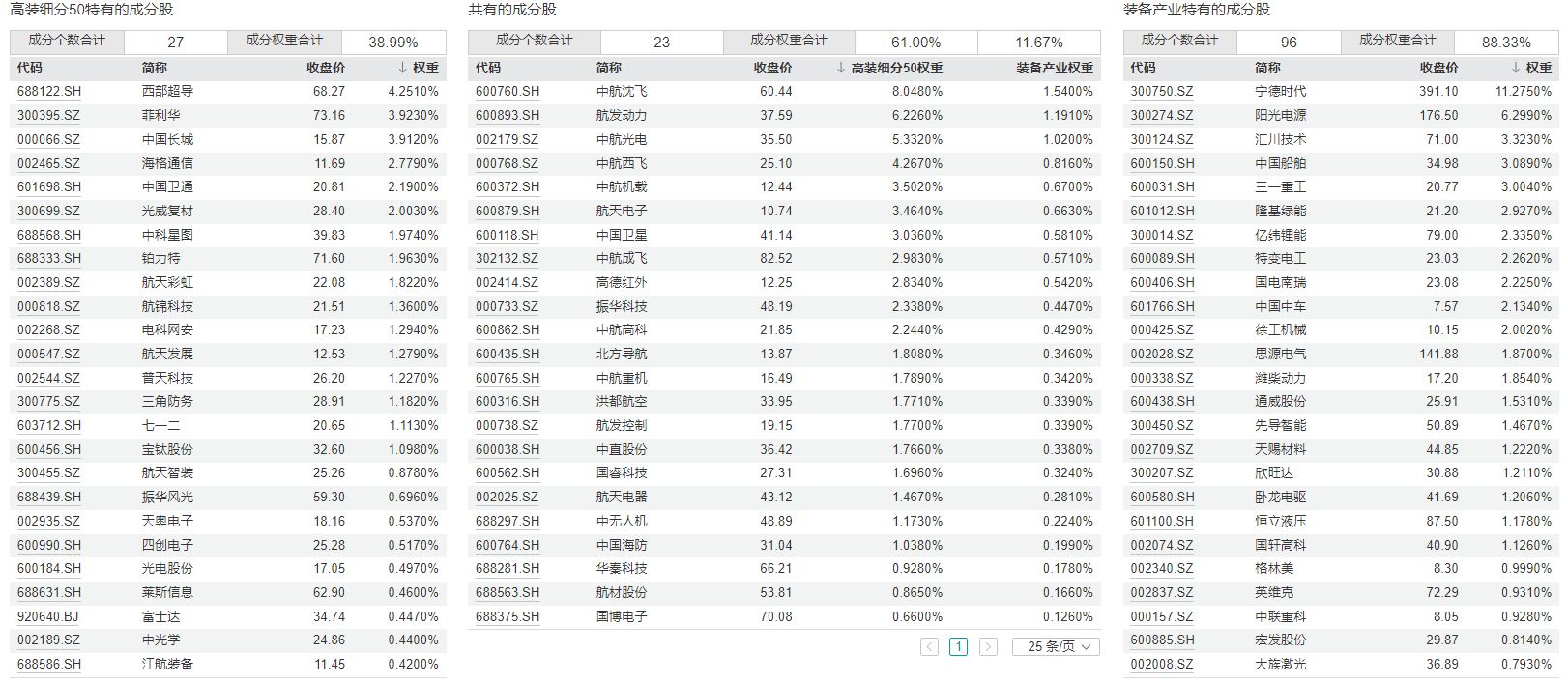 进一步对比两个指数的成分股,可以发现两个指数共同的成分股数量是23只,中证高端装备细分50指数独有的成分股数量是27只,中证装备产业指数独有的成分股数量是96只。整体差异比较大。
