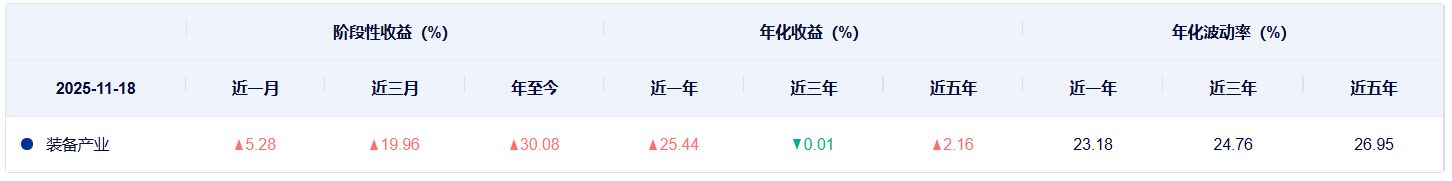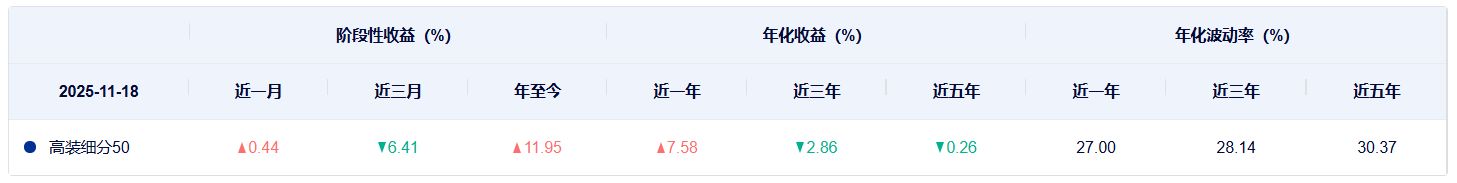 再看两个指数的过往表现,从近一年、近三年到近五年,中证装备产业指数的收益均好于中证高端装备细分50指数,同时,中证高端装备细分50指数的年化波动率还高于中证装备产业指数。