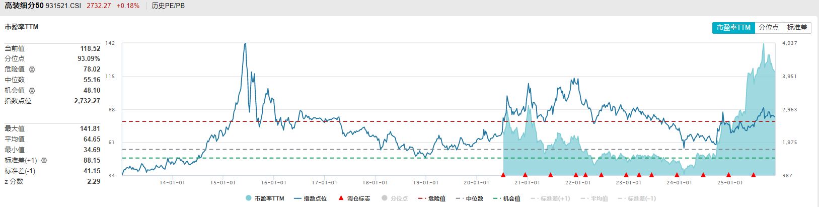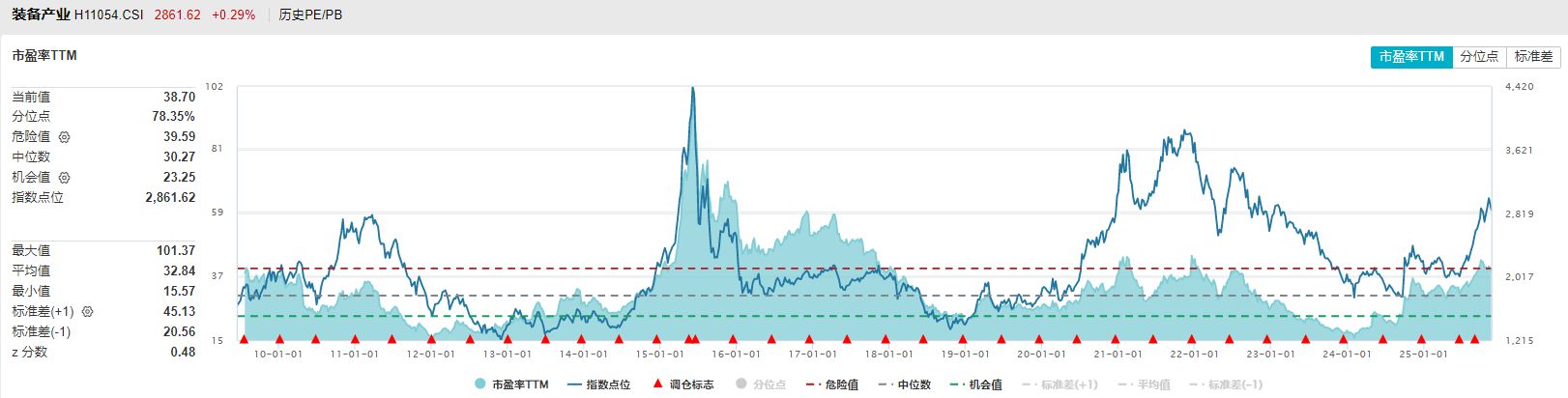 最后对比一下两个指数的估值水平,Wind数据显示,中证高端装备细分50指数目前的市盈率TTM已经回升到了历史90%分位以上,中证装备产业指数的市盈率TTM接近历史80%分位。