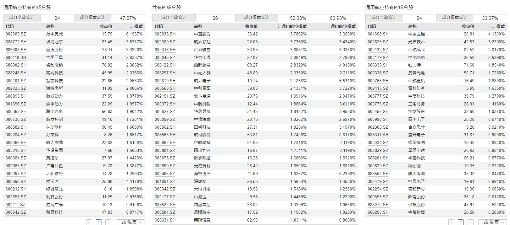 进一步对比两个指数的成分股,可以发现两个指数相同的成分股共有26只,各自独有的成分股都是24只。其中,国证通用航空产业指数独有的成分股包括了万丰奥威、珠海冠宇、应流股份等,中证通用航空主题指数独有的成分股包括了中国卫通、光启技术、中航成飞等。