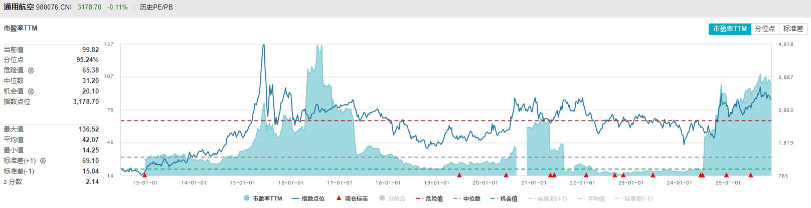 继续对比两个指数目前的估值水平,Wind数据显示,国证通用航空产业指数目前的市盈率TTM在历史90%分位以上,而中证通用航空主题指数目前的市盈率TTM在历史40%分位以上。