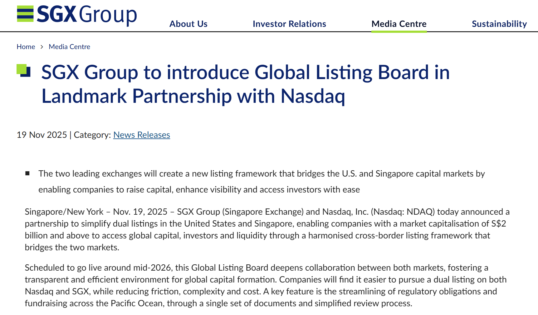 ①新交所、纳斯达克宣布合作推出“全球上市板”,符合条件的公司只需提交一套文件,即可同步挂牌;②在交易流动性长期薄弱的背景下,新加坡试图以“双重上市+全天候价格发现”留住区域科技巨头。