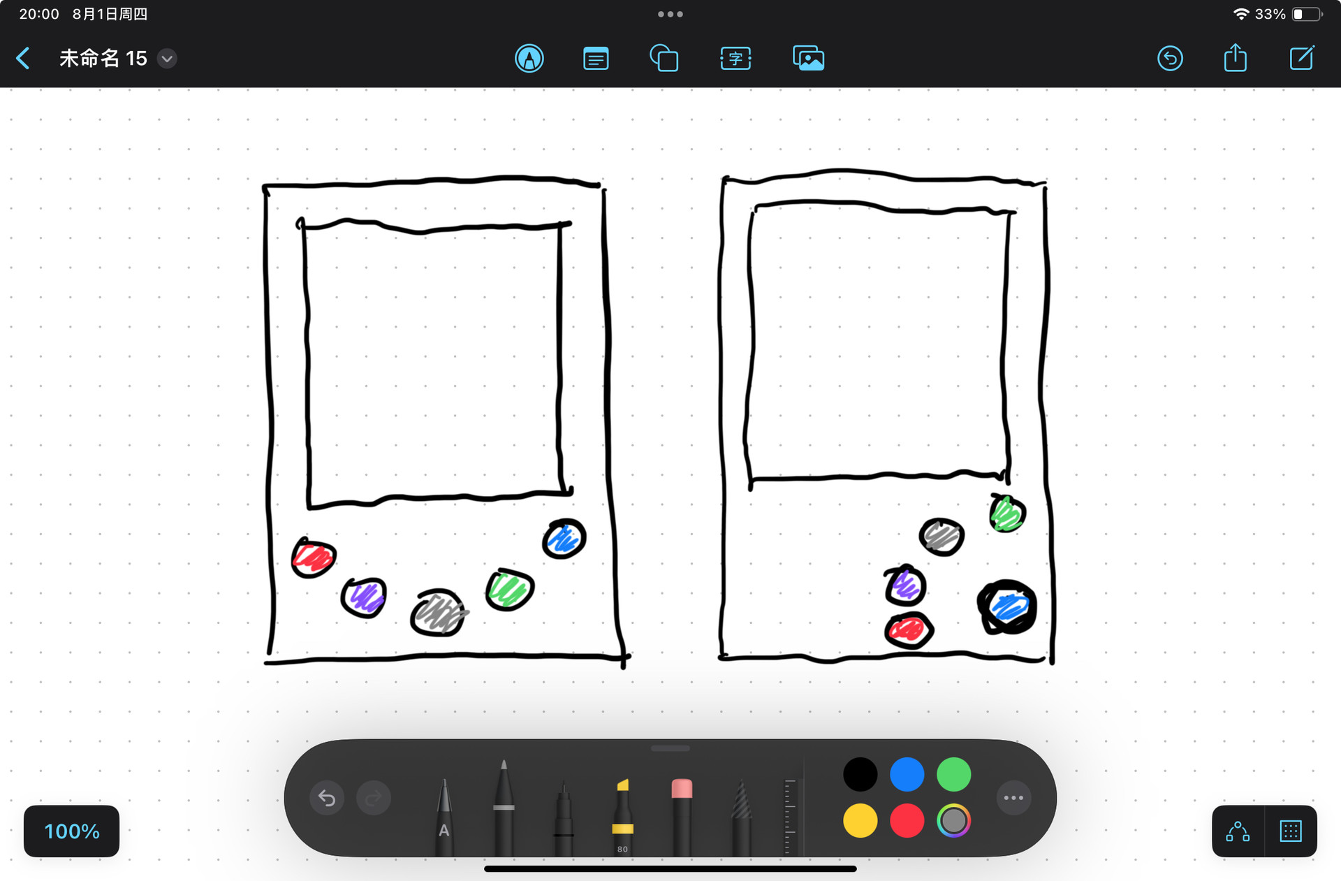 后来,打算将这些按钮排列成一个圆弧形或者扇形,没实际写代码,光是画个草图就感觉还是很丑。也想过做成 iOS 中 Menu 那个样式的按钮菜单,但是受限于屏幕空间,也放弃了。也想过使用 SwiftUI 的 Action Sheet 或者 Confirmation Dialog,但是这个控件需要再弹出一个页面,会有一种中断的打扰,也放弃了。