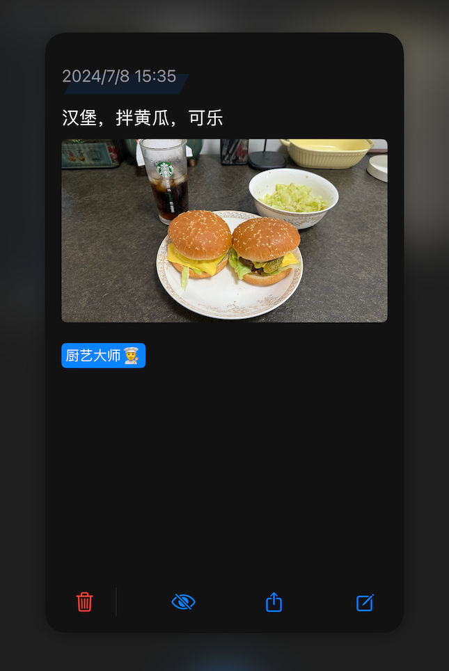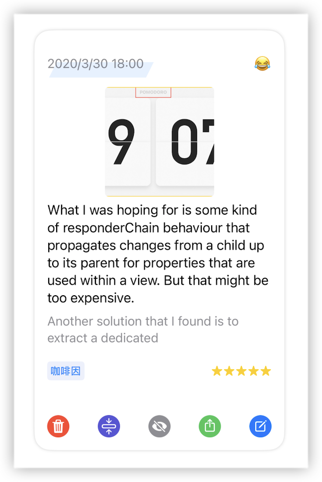 其实在 demo 阶段的时候,我曾经采用过这个交互方式:点击日记条目出现一个预览页面,页面主体是日记的内容,页面底部是所有的操作按钮。这次我也采用了这个方案,我计算了一下,只有打开编辑页需要多点击一次,而其他操作的步骤和原来是一样的,都是需要操作两下。日记的预览内容直接复用的就是日记的分享样式,头疼的是这些按钮怎么设计……