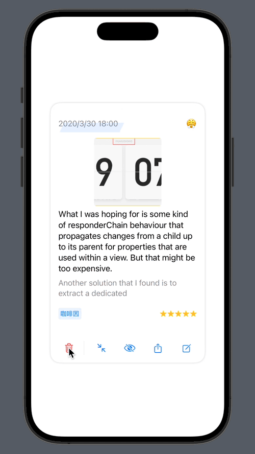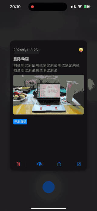 之前的删除交互就是左划日记条目,点击删除按钮,弹出一个 Alert,点击确定后再删除日记。一开始我也想沿用这样的设计,但是首先遇到的问题就是 Alert 不弹出。新加入的预览卡片是通过肘子哥的 SwiftUIOverlayContainer 这个 package 来实现的,就是在日记列表页面弹出一个模态页面,可能是因为这个 package 导致预览页面和父页面的 alert 冲突导致,或者是其他 SwiftUI 什么乱七八糟的 bug,导致 Alert 无法显示。塞翁失马,焉知非福,被逼着变通思路,既然无法显示 Alert,何不如将整个预览页面变成一个 Alert,这样不就完美解决了吗。于是改成点击删除按钮,下面的操作按钮变成取消按钮和确认按钮。