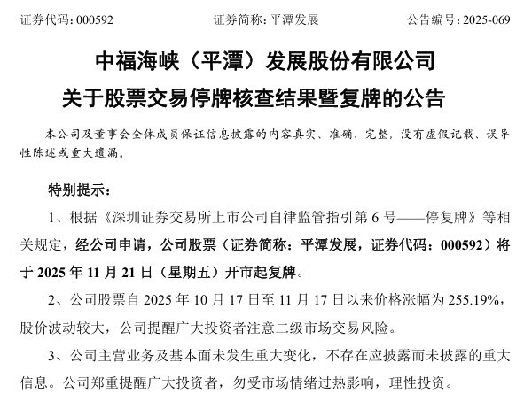 同日,平潭发展(000592)公告,此前,公司就股票交易波动情况进行了停牌核查。鉴于相关核查工作已完成,根据《深圳证券交易所上市公司自律监管指引第6号——停复牌》等相关规定,经公司申请,公司股票(证券简称:平潭发展,证券代码:000592)将于2025年11月21日(星期五)开市起复牌。