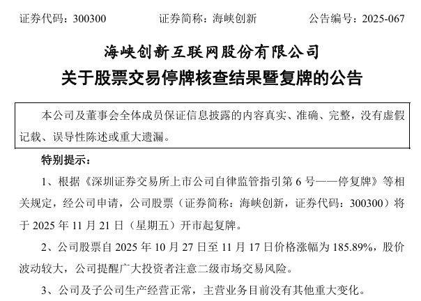 海峡创新(300300)11月20日晚间公告,此前,公司就股票交易波动情况进行了停牌核查。鉴于相关自查工作已完成,根据《深圳证券交易所上市公司自律监管指引第6号——停复牌》等相关规定,经公司申请,公司股票(证券简称:海峡创新,证券代码:300300)将于2025年11月21日(星期五)开市起复牌。