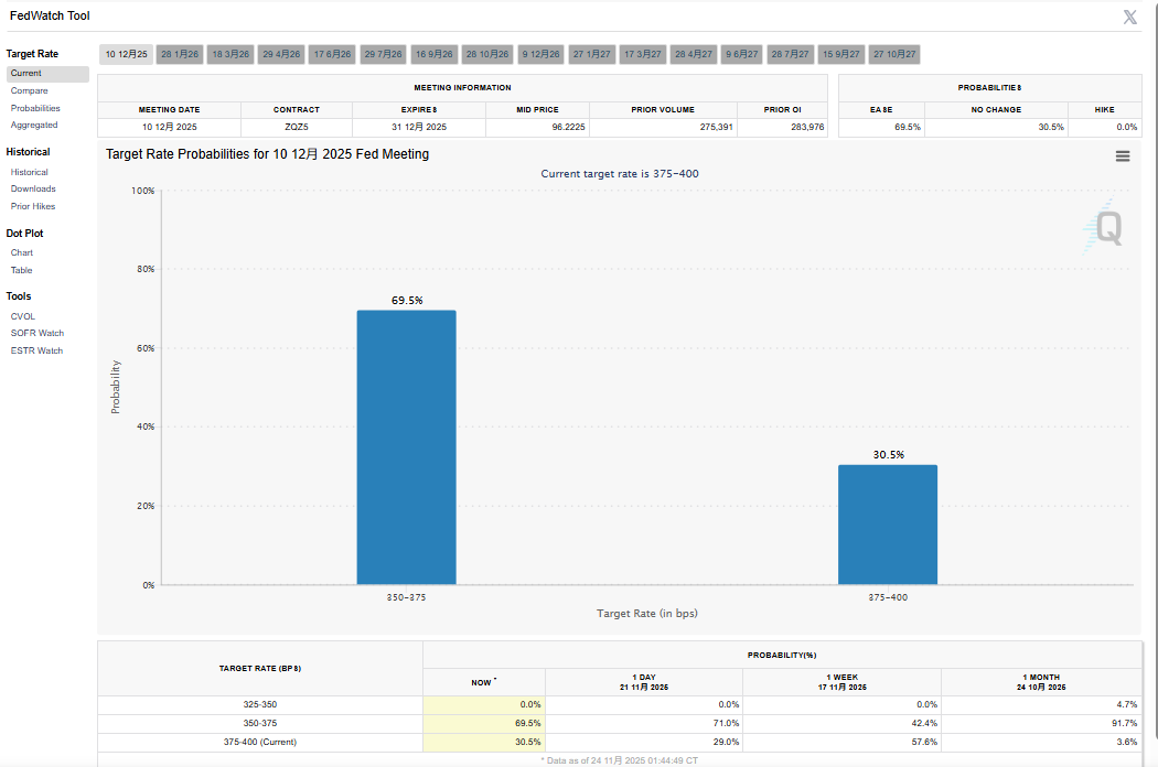 根据CME FedWatch数据,市场目前预计美联储12月维持利率不变的概率为30.5%,而降息25个基点的概率升至69.5%,相比一周前的约42%明显提升。