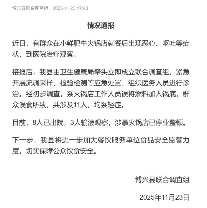 11月23日,山东滨州博兴县联合调查组通报,近日群众在小鲜肥牛火锅店就餐后出现恶心呕吐等症状。经查,系火锅店工作人员误将燃料加入锅底,致11人误食轻症,其中8人已出院,3人输液观察,涉事店已停业整顿。下一步,当地将加大餐饮服务单位食品安全监管力度,保障公众饮食安全。