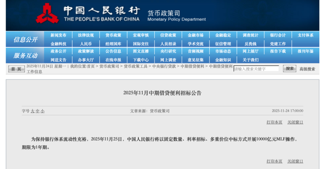 11月24日,央行发布消息称,为保持银行体系流动性充裕,2025年11月25日,中国人民银行将以固定数量、利率招标、多重价位中标方式开展10000亿元MLF操作,期限为1年期。