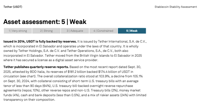 评级公司标普全球周三发布报告称,基于全球最大稳定币USDT发行商Tether近年来不断增加高风险资产的配置,将该稳定币与美元锚定能力的评级下调至“弱”,也是5级评价体系中最差的一档。