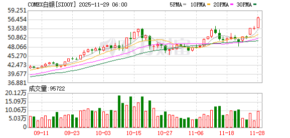 贵金属市场再掀狂潮,白银期货、现货均创新高,截止收盘,纽约期银涨超6%、史上首次突破57美元/盎司;白银现货涨超5%、史上首次站上56美元/盎司。白银受到多重利好支撑,包括市场对美联储12月降息的预期升温、资金流入白银ETF,以及持续紧张的供应状况。受芝商所Comex期货交易暂停数小时影响,金银两市周五均出现流动性极低与价格异动的情况。