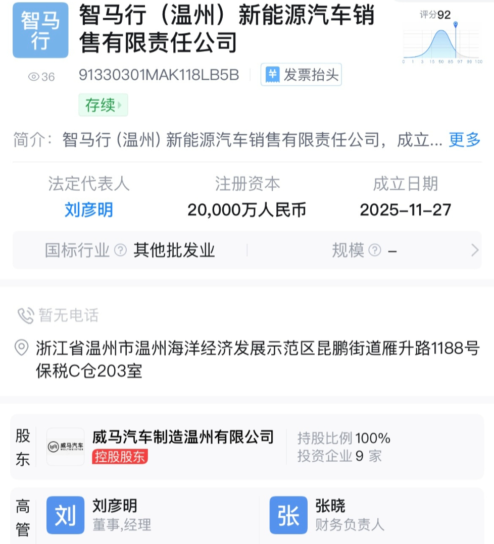 天眼查App显示,11月27日,智马行(温州)新能源汽车销售有限责任公司成立,法定代表人为刘彦明,注册资本2亿元人民币。