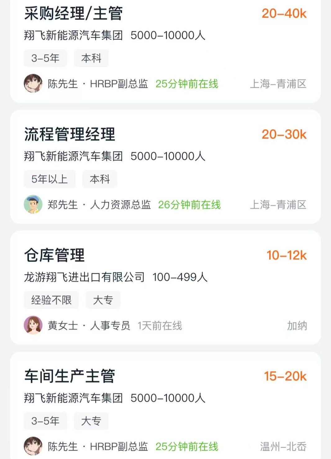 直至目前,记者发现威马汽车仍在“招兵买马”。从第三方招聘软件来看,翔飞新能源汽车集团招聘地址主要为威马汽车设计·采购中心和威马汽车制造温州有限公司,招聘的岗位覆盖了产品流程管理经理、采购经理、车间生产主管等。