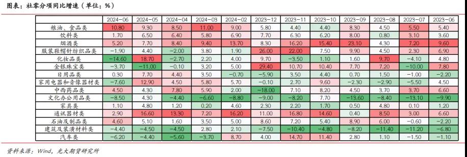 根据wind,光大期货研究所调研,社会零售消费方面,近一年都维持增长的,是粮油食品、饮料、烟酒、通讯器材四大类。