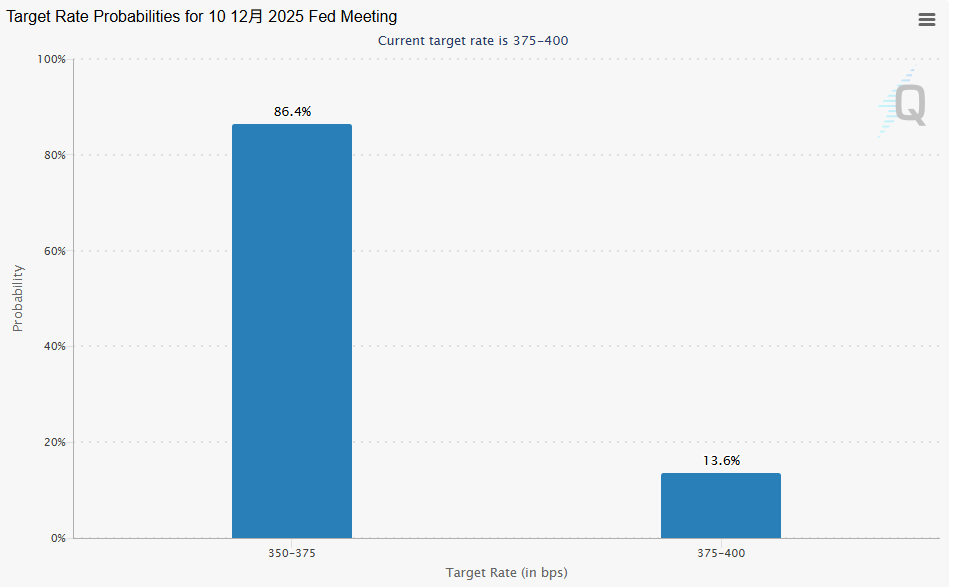 好消息是,在多位美联储官员表示愿意放松货币政策后,交易员们加大了对该行12月降息的押注。芝商所“美联储观察”工具显示,市场预计该行降息25个基点的概率为86.4%。