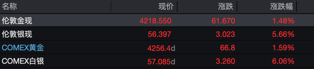比黄金表现更亮眼的是白银,白银期现价格均创下纪录新高。截至收盘,伦敦银现涨5.66%,报56.397美元/盎司,COMEX白银报57.085美元/盎司,上涨6.06%。