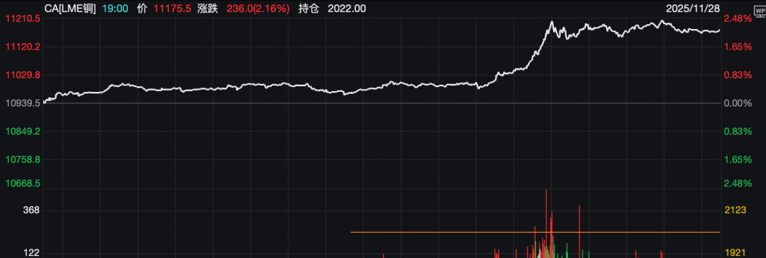铜价亦创历史新高。行情数据显示,LME铜盘中一度上涨近2.5%,达到每吨11210.50美元,触及记录新高。