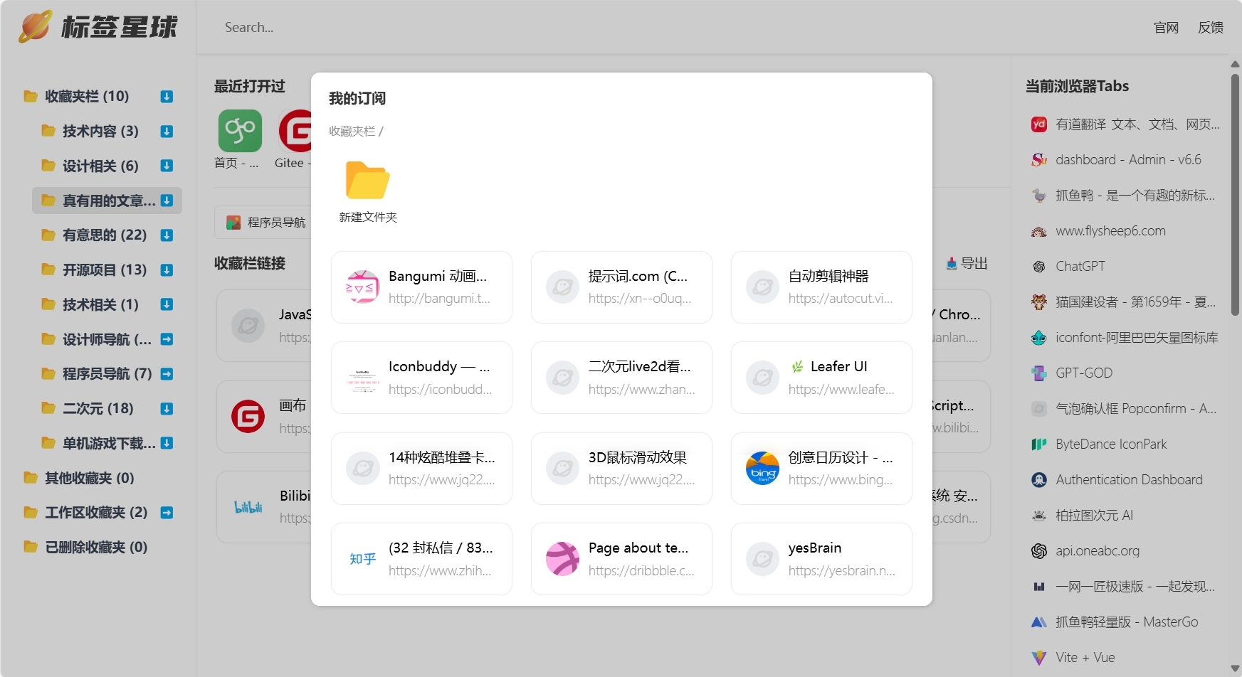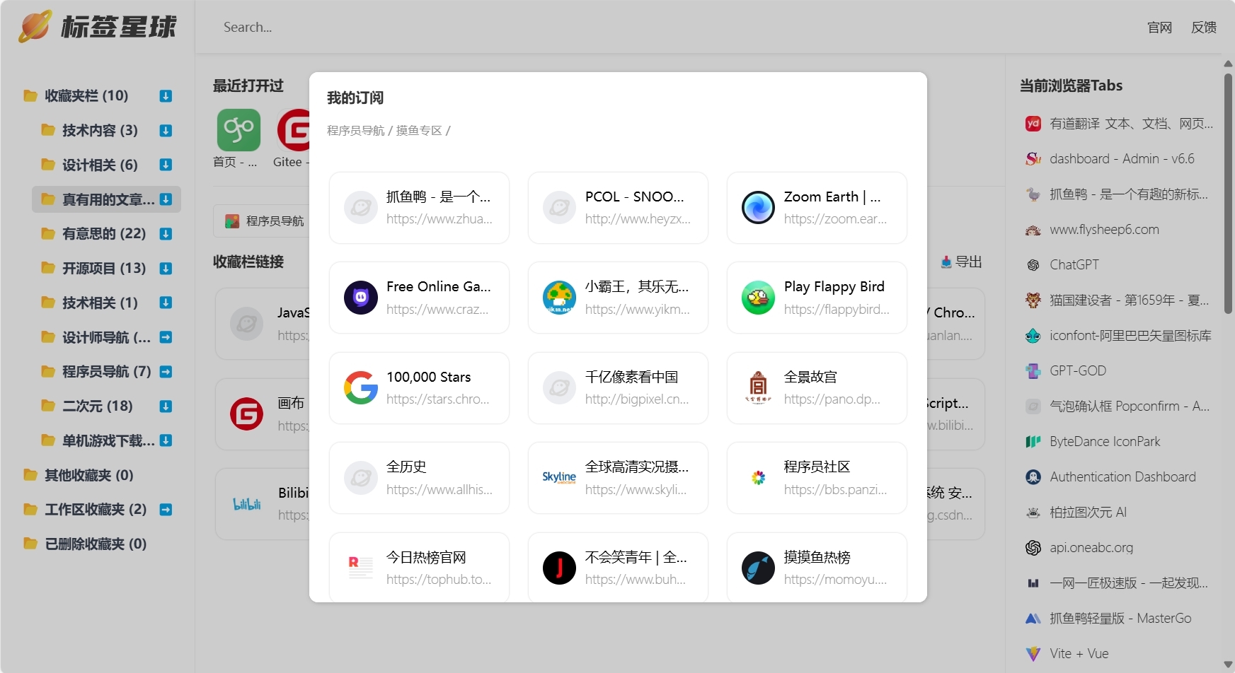 标签星球是一个基于浏览器的收藏夹管理工具,你可以轻松的管理你的收藏夹、Tabs 书签、书签分类、搜索记录、订阅源等数据,让你的浏览器成为一个仪表盘。