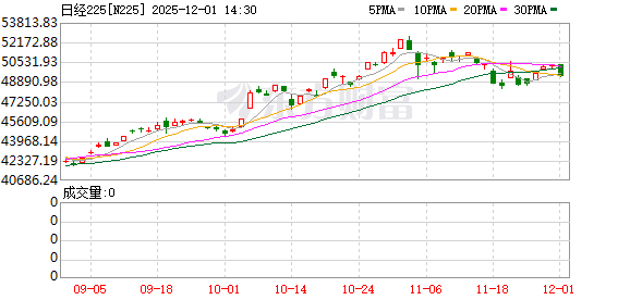 12月1日,日本股市重挫,日经225指数一度跌超2%至49224.94点,盘中一度跌超千点,截至收盘,日经225指数收跌1.89%,报49303.28点。